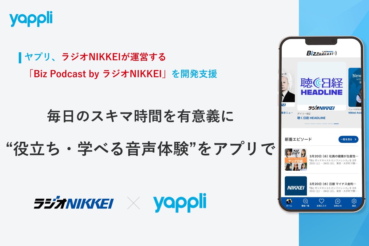 ヤプリ、ラジオNIKKEIが運営する「Biz Podcast by ラジオNIKKEI」を開発支援〜毎日のスキマ時間を有意義に 日々のニュースや、“役立ち・学べる音声体験”をアプリで〜(PR TIMES)