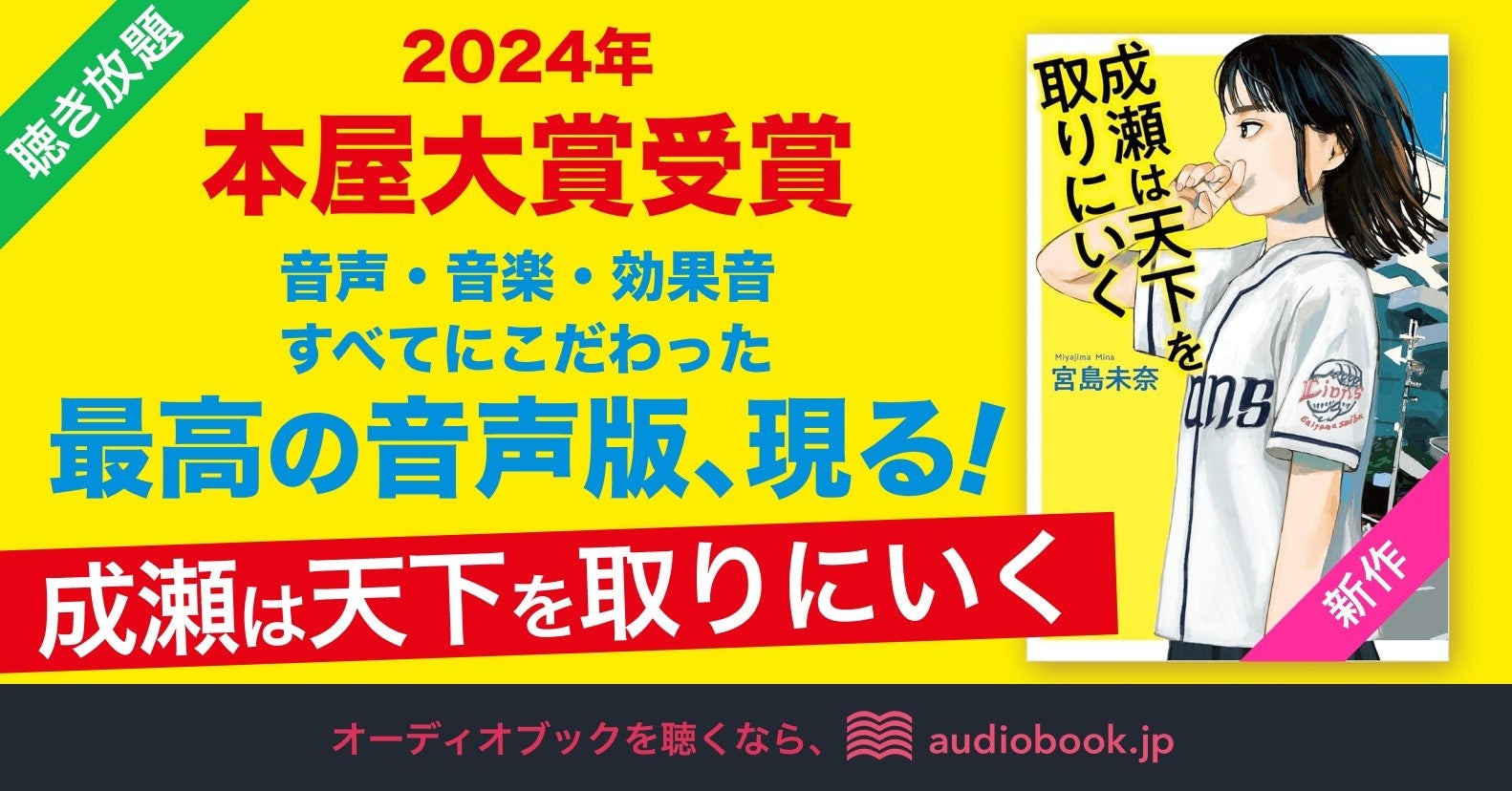 思いのほか、主人公の成瀬の声色が両社版とも似ていたのは偶然でしょうか。オーディブル版はいわゆる朗読のオーディオブックで、セリフも1人のナレーターさんが演じ分けて読んでいる感じでした。会話も多い本書ですが、普通に小説のオーディオブックを聴いている感じです。一方でaudiobook.jp版は音声ドラマ仕立てで、BGMが入ったり、登場人物にナレーターが配役されています。小説とドラマの中間のコンテンツを楽しんでいる、という感覚で聴きました。ト書き部分もそれなりにあるので純粋なドラマを見ている感じではありませんが、リッチ感はありますね。電車の中など外部で音がしている状況ではBGMがほぼ聞こえないので、オフにできればいいなあ、とは思いました(そういうものではないことは承知しております)。