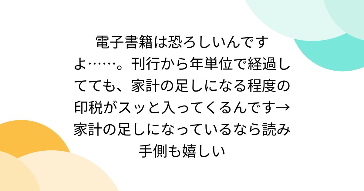 電子書籍は恐ろしいんですよ……。刊行から年単位で経過してても、家計の足しになる程度の印税がスッと入ってくるんです→家計の足しになっているなら読み手側も嬉しい(togatter)