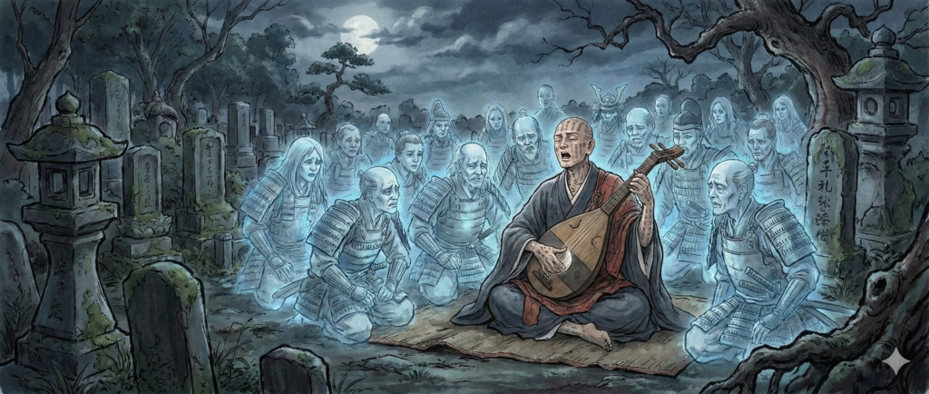 nano bananaさんに耳なし芳一の、墓で幽霊に囲まれて一人琵琶を奏でるところのシーンを、ってお願いしたらお経が書かれたバージョンできましたよ。すごいや。
