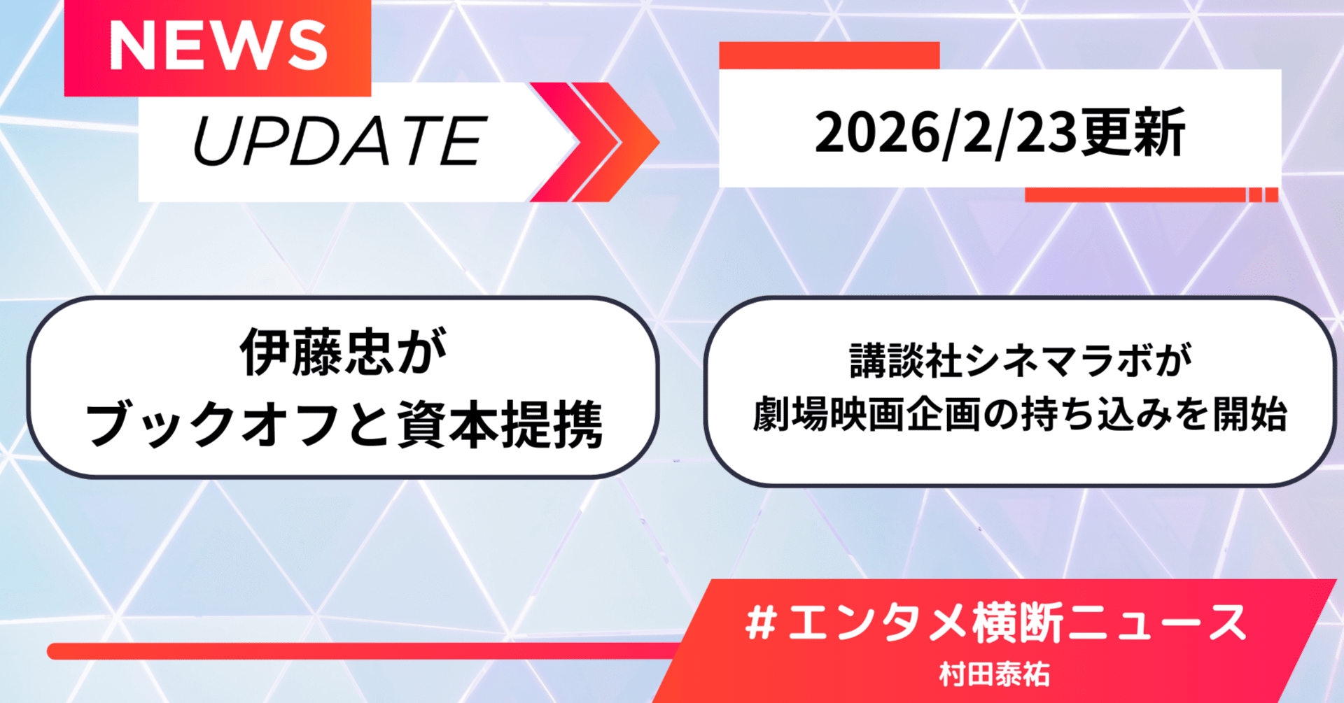 【エンタメ横断ニュース】伊藤忠がブックオフと資本提携/講談社シネマラボが劇場映画企画の持ち込みを開始(26/2/23)|村田泰祐